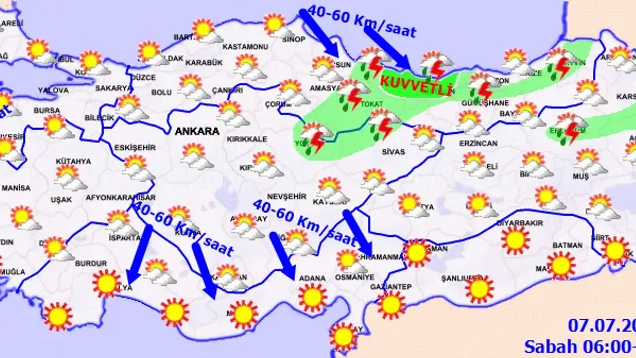 Meteoroloji Genel Müdürlüğü, 7 Temmuz hava durumu tahminlerini paylaştı. Birçok il için kuvvetli yağış ve fırtına uyarısı yapıldı. İşte il il hava durumu tahminleri...